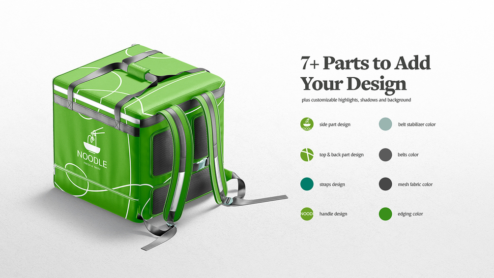 Easily editable Delivery Bag Mockups - for catering companies, restaurants or cafes. Adjust the color for every element of the bag from zipper to straps, add your branding design or logo and make it look realistic with light effects.