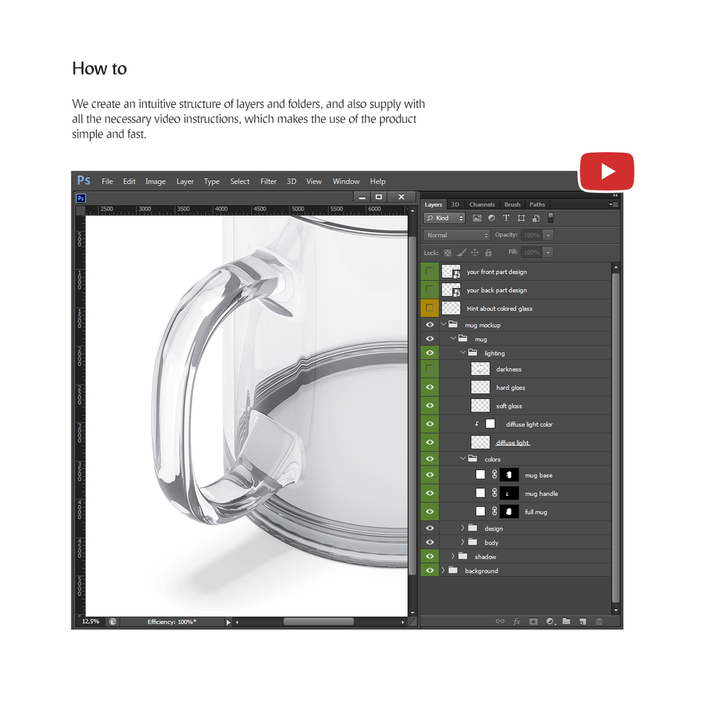 • Work with 3D objects can cause errors in Photoshop. We recommend to follow the video instructions when you working with this mockup;