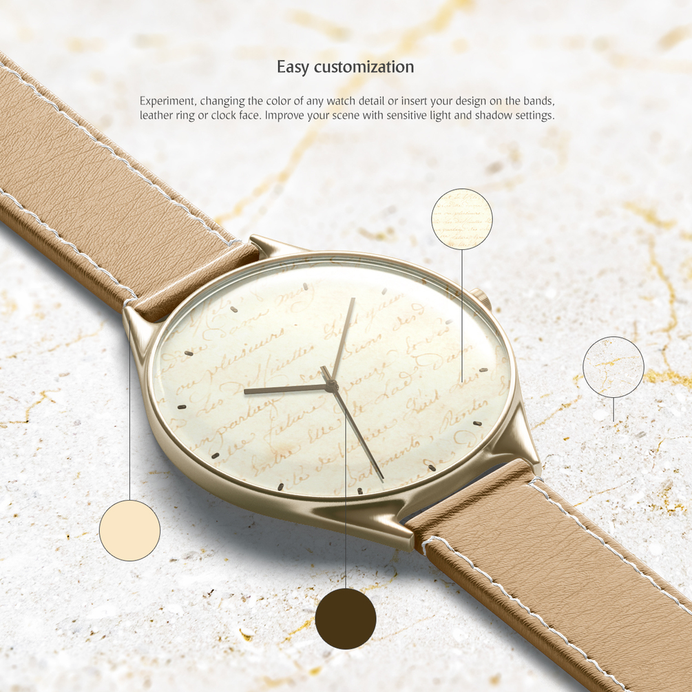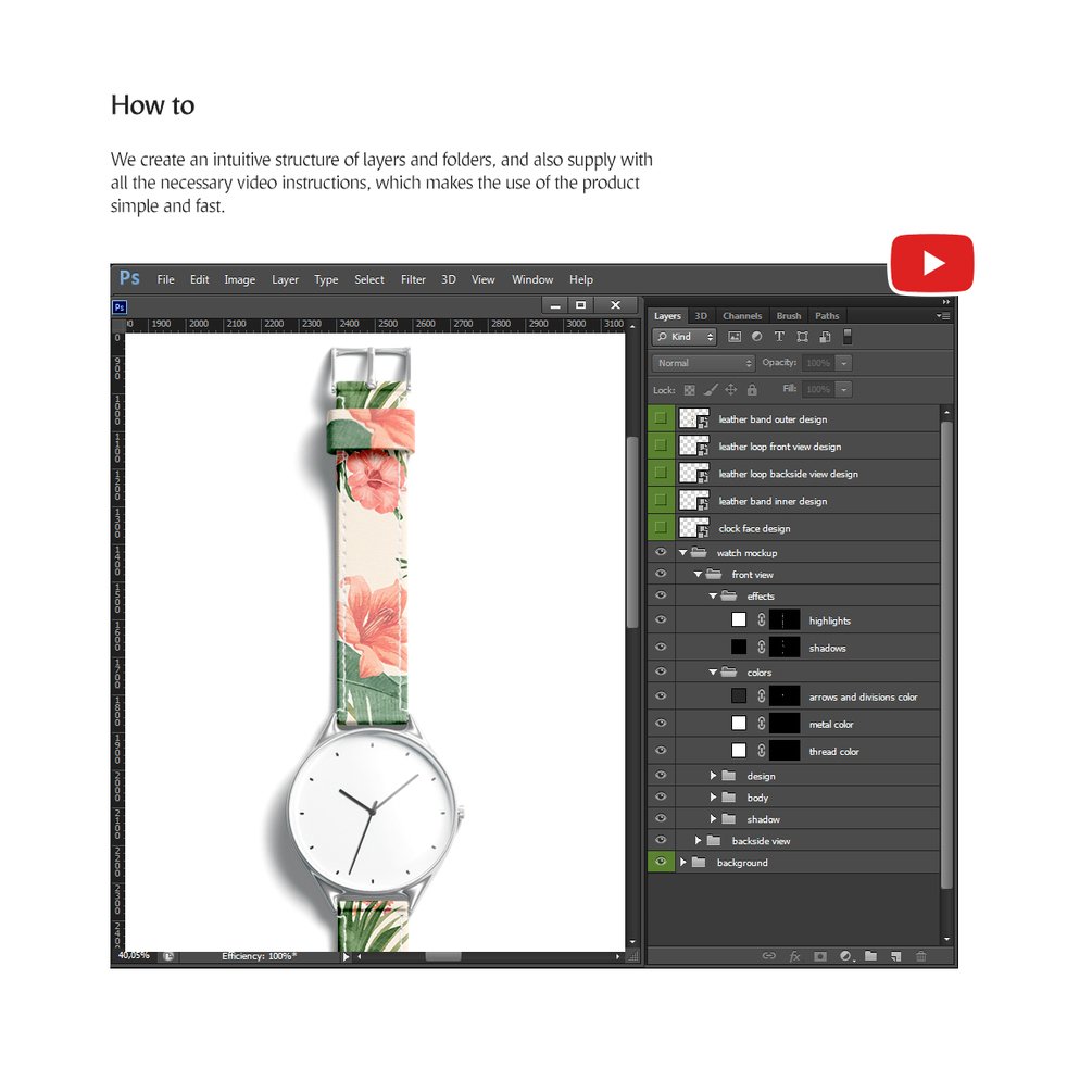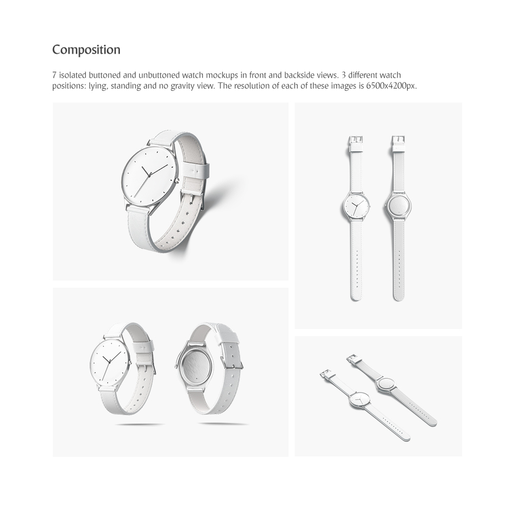 psd with lying watch (top and side view, front and back side); - instructions.txt (with links to video-tutorials);